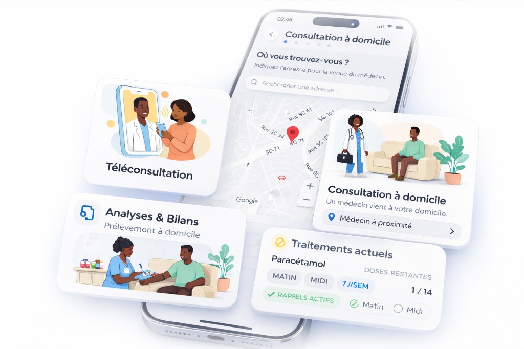 Visite à domicile ou téléconsultation vidéo selon votre besoin. Analyses prescrites par le médecin si nécessaire.